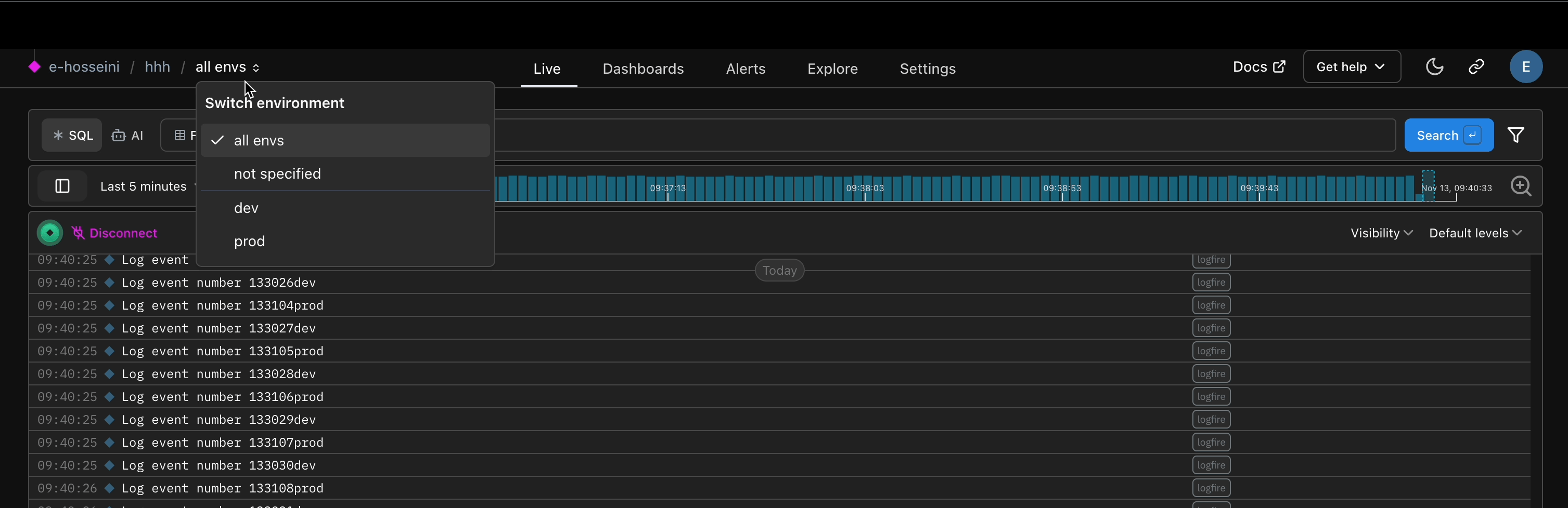 Once set, you will see your environment in the Logfire UI all envs dropdown, which is present on the Live View, Dashboards and Explore pages: